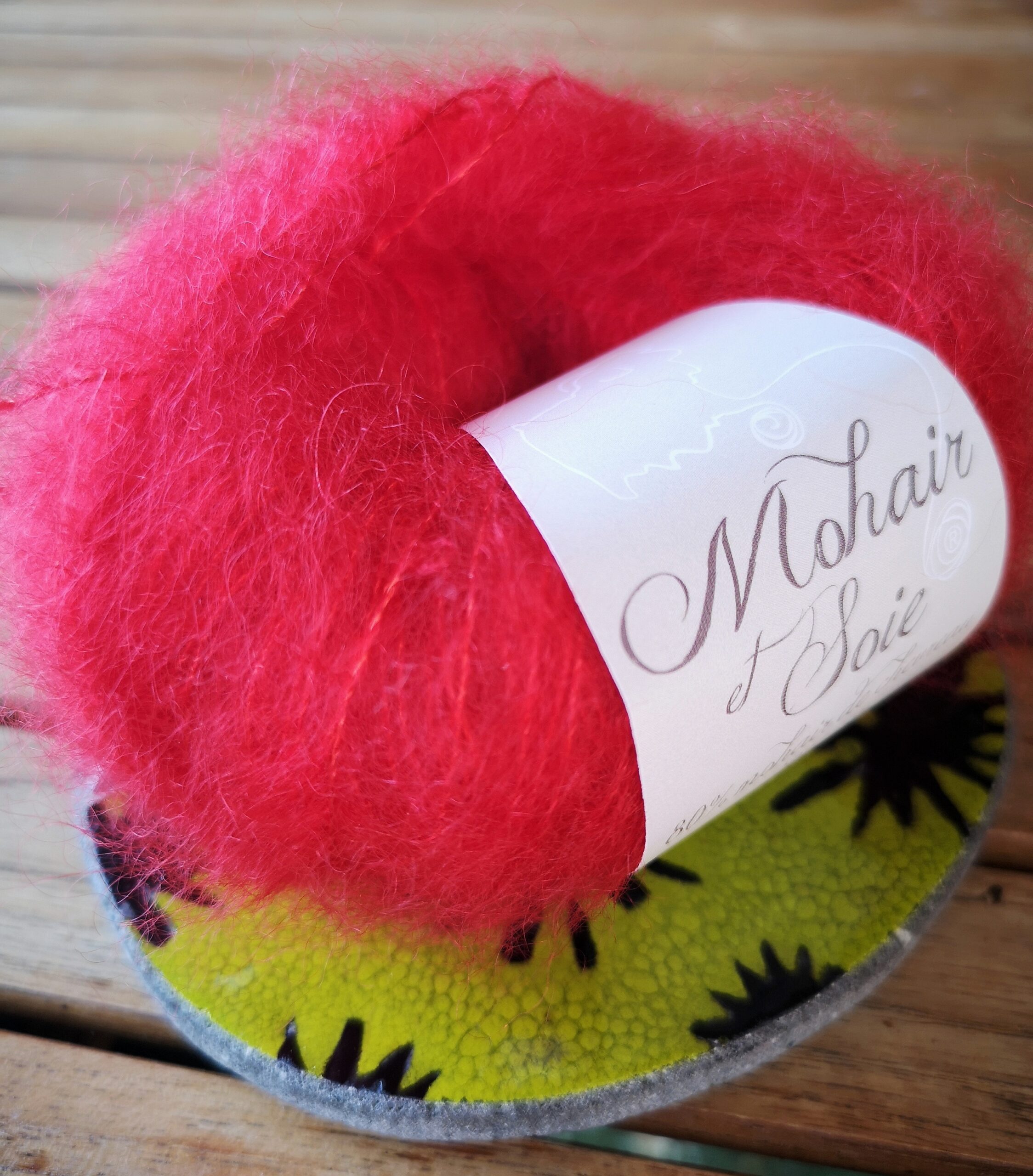 Toutes les pelotes (dont Pomme d’Amour – 71858) sont en Mohair & Soie, elles sont fabriquées avec 80% de Mohair de chevreau et 20% de Soie. Ce Mohair est issu d’élevages Français de chèvres Angora. Les animaux sont tondus deux fois par an dans les fermes. Les toisons de mohair sont triées à la main par mes soins.