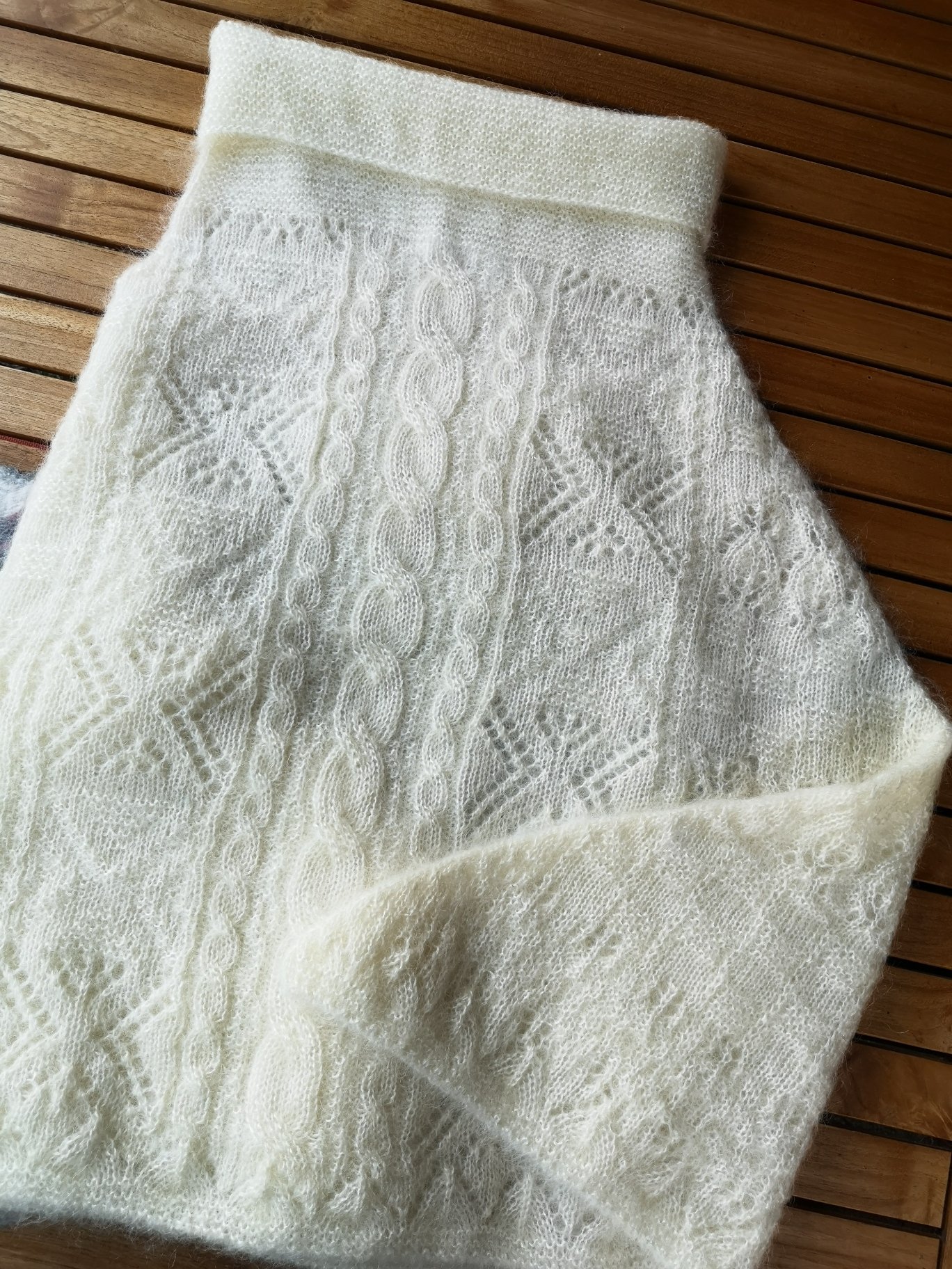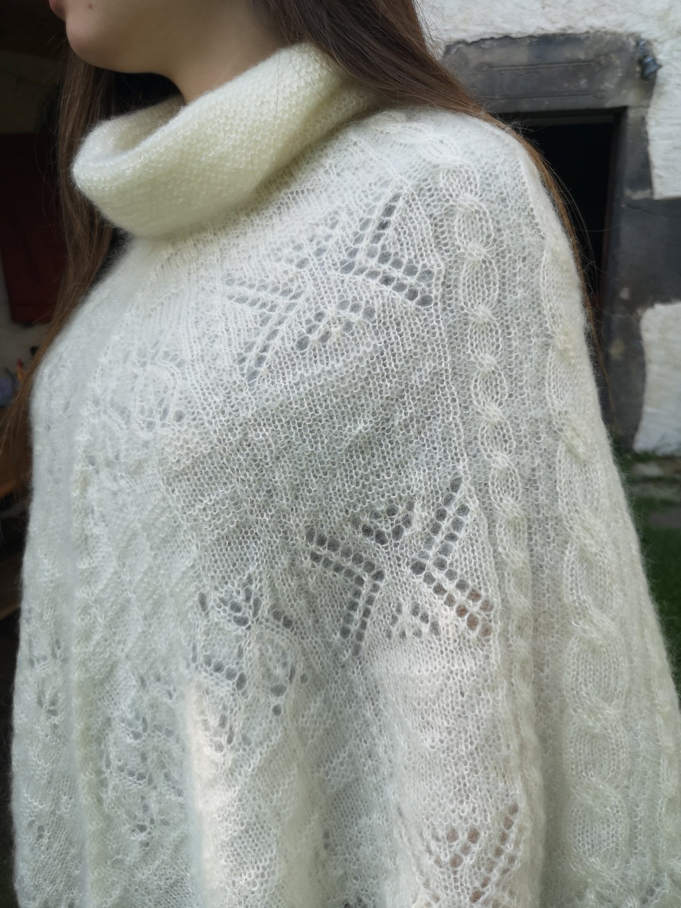 Ce magnifique poncho épais en Mohair Ecru, très bien travaillé avec de jolis points pourra être porté en extérieur comme en intérieur. Sa grande taille vous couvrira parfaitement. Son col roulé et son épaisseur vous protègeront du froid. Article très enveloppant de demi-saison ou à porter sur une petite veste en hiver et à garder à portée de main en belle saison pour les fraîcheurs du soir !